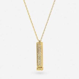 قطعة مجوهرات فريدة من نوعها. تتميز هذه القلادة بتصميم مستطيل مغلق ومرصع بأحجار لامعة، وعند سحب القلادة تكشف عن رسالة مخفية بداخلها. إنه خيار مثالي لهدية شخصية وعاطفية لا تُنسى.